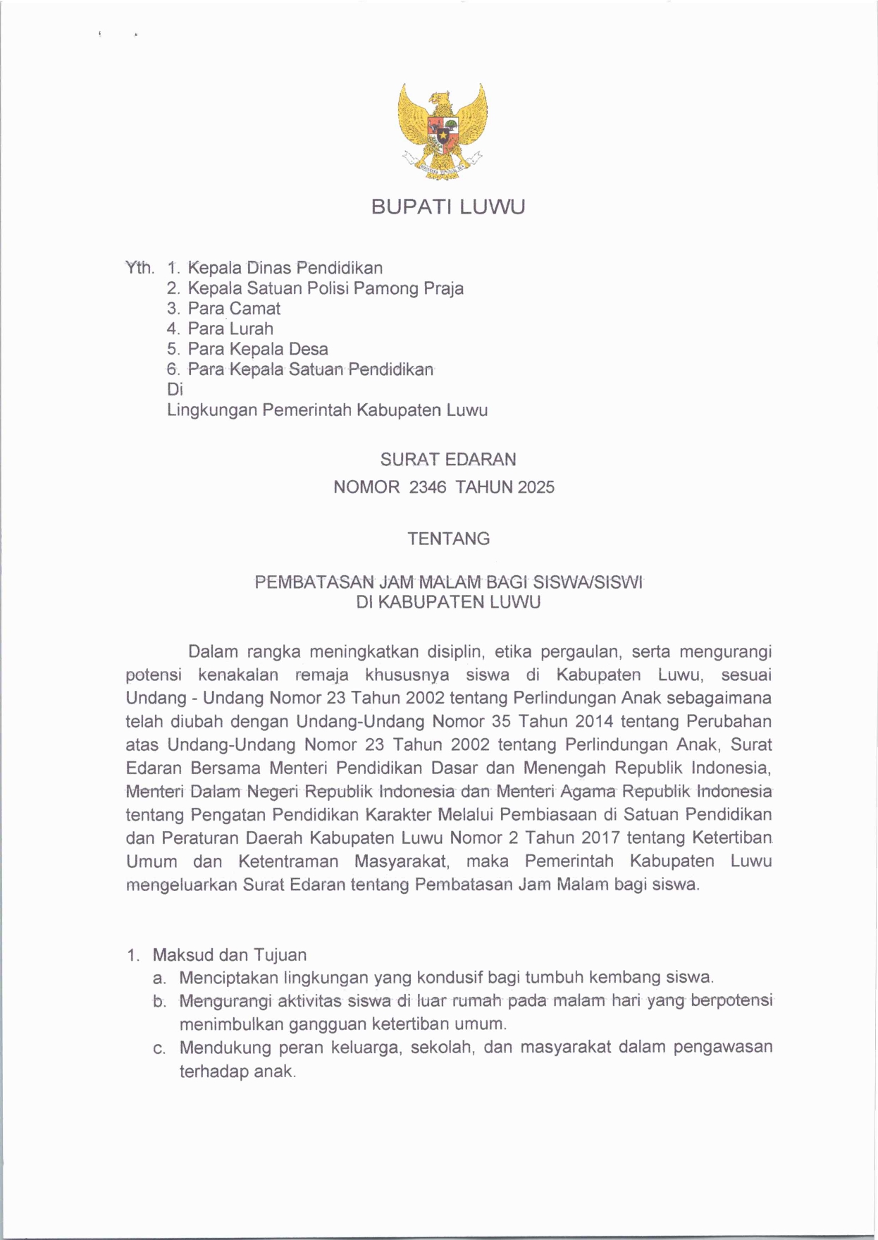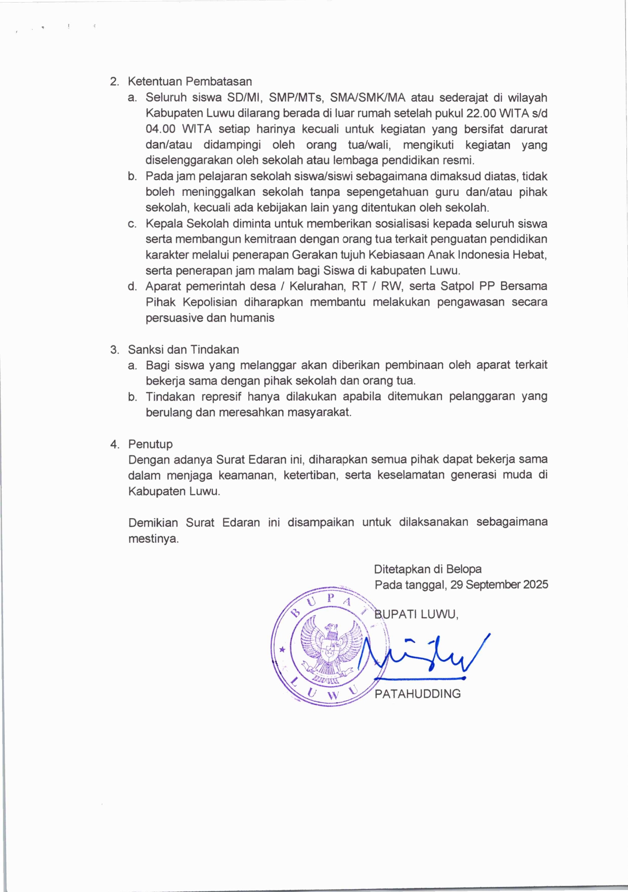 Belopa, 29 September 2025 – Bupati Luwu, Patahudding, mengeluarkan Surat Edaran Nomor 2346 Tahun 2025 tentang Pembatasan Jam Malam bagi Siswa/Siswi di Kabupaten Luwu. Kebijakan ini diberlakukan sebagai langkah meningkatkan disiplin, etika pergaulan, serta mengurangi potensi kenakalan remaja.
