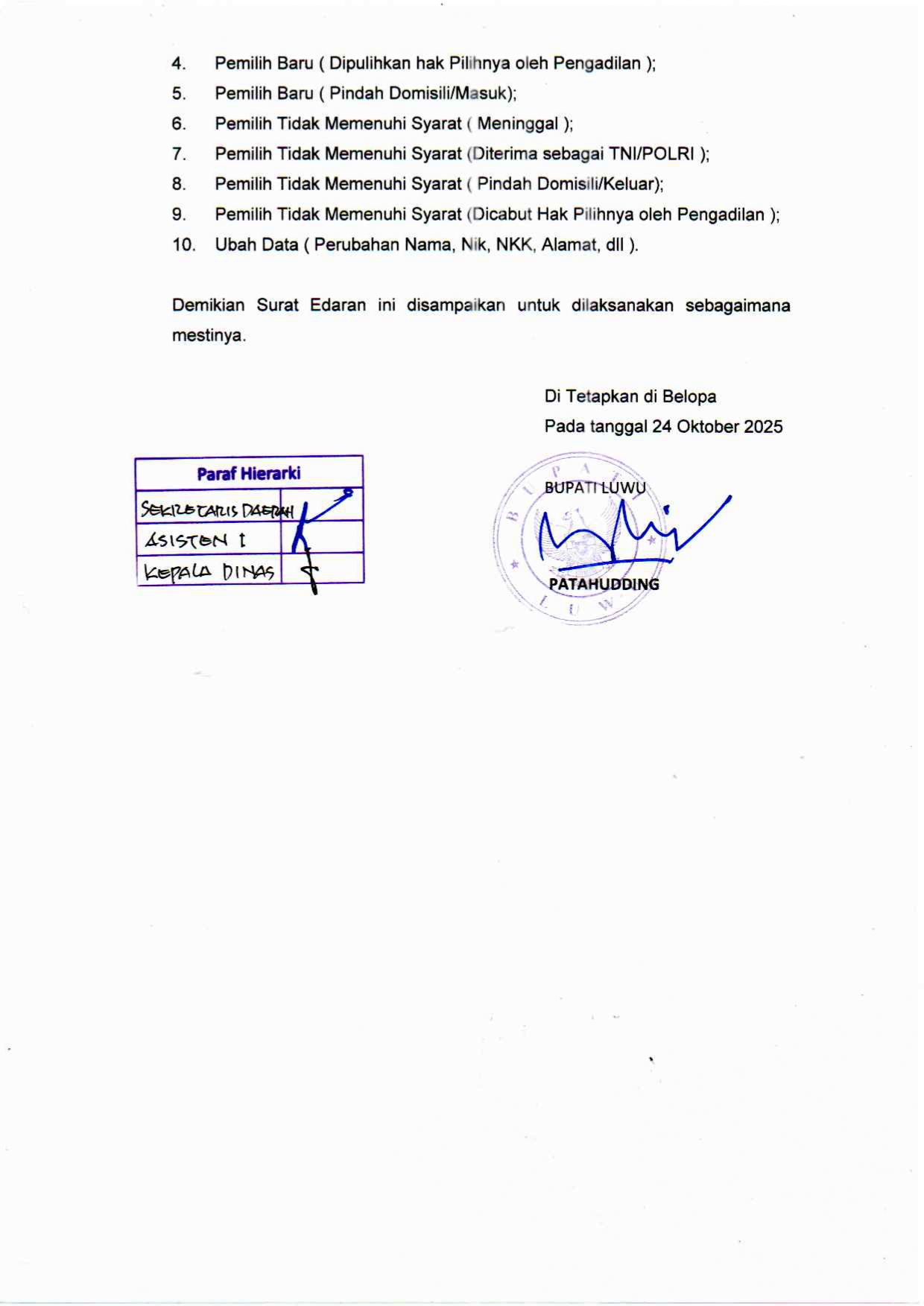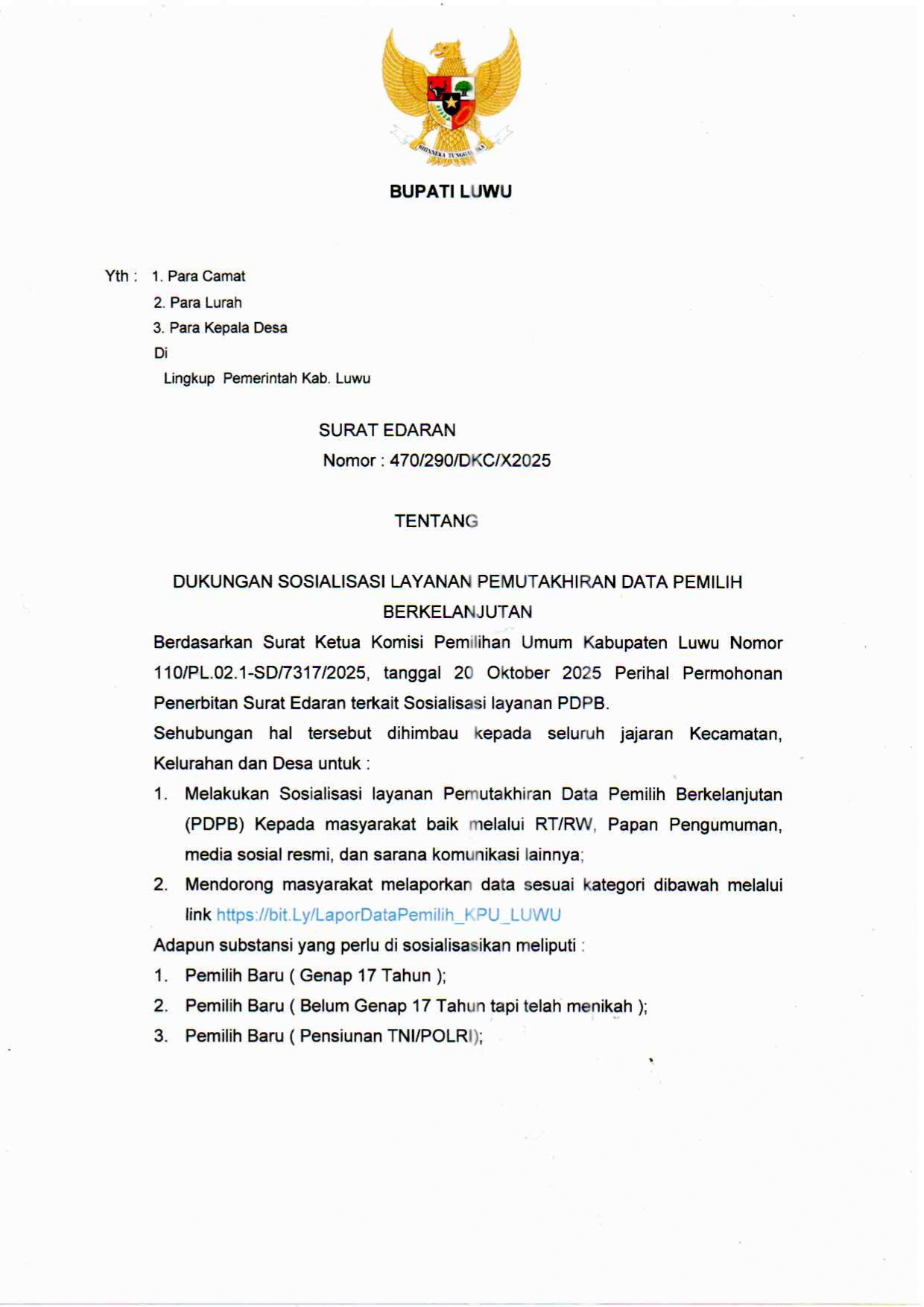 Pemerintah Kabupaten Luwu menerbitkan Surat Edaran Nomor: 470/290/DKC/X/2025 yang berisi dukungan penuh terhadap pelaksanaan Sosialisasi Layanan Pemutakhiran Data Pemilih Berkelanjutan (PDPB). Surat edaran ini ditujukan kepada seluruh Camat, Lurah, dan Kepala Desa se-Kabupaten Luwu sebagai bentuk komitmen pemerintah daerah dalam memastikan data pemilih selalu akurat, mutakhir, dan dapat dipertanggungjawabkan.